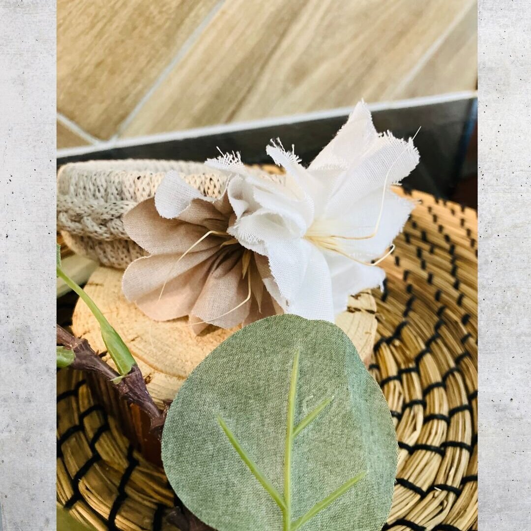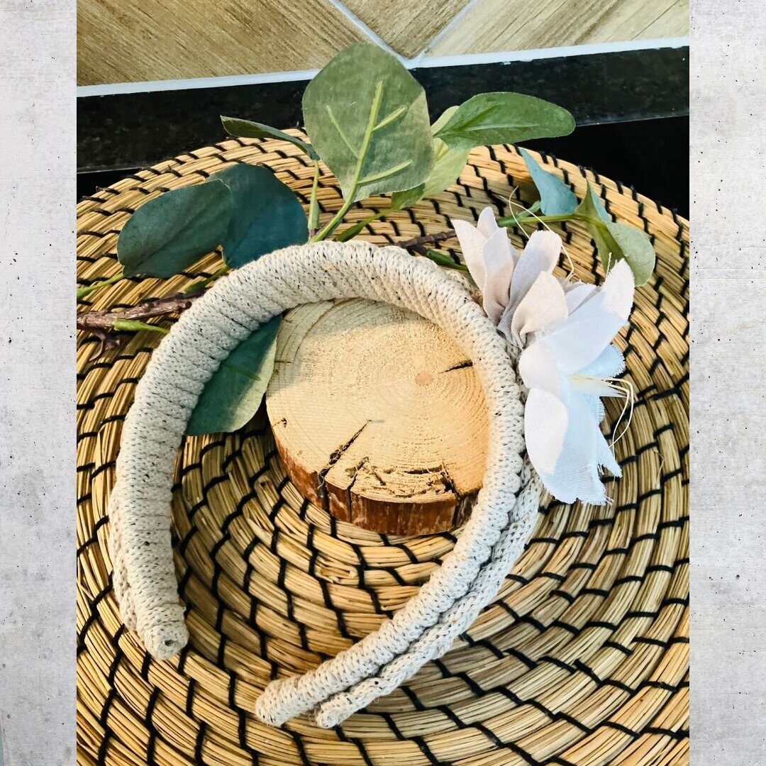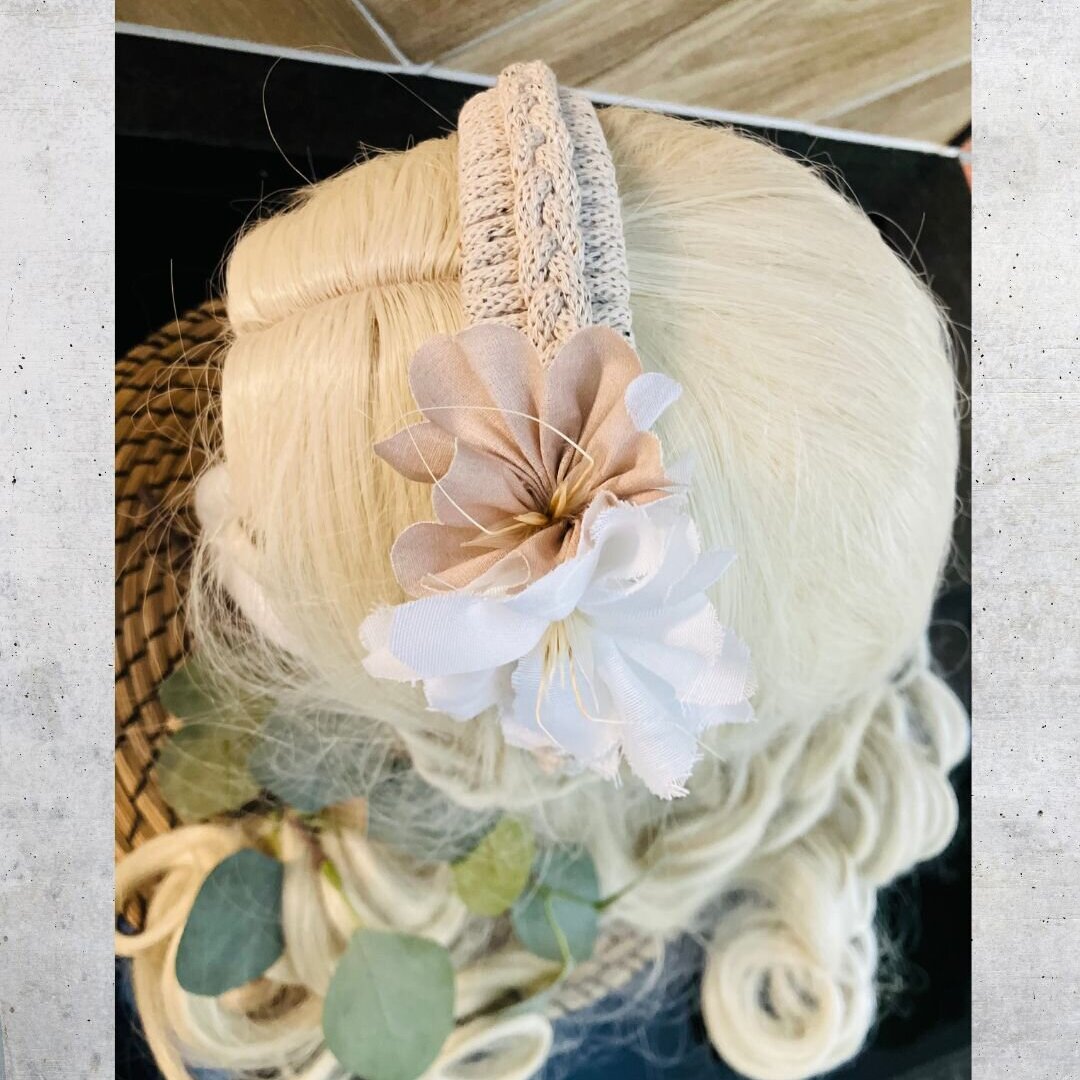 Ein Haarreif in seiner sanftesten Form: zart umwickelt mit Makrammegarn in natürlichen Tönen, geschmückt mit Blüten aus liebevoll verarbeiteten Stoffresten. Die zarten Weiß, Altrosa und Cremetöne verleihen diesem Accessoire eine pure, schlichte Eleganz -